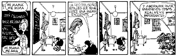 Quería compartir con todos vosotros esta viñeta. La verdad es que, en ocasiones, me siento como la profesora de Mafalda. En particular, cuando me interesa practicar en clase la forma de, por ejemplo, un tiempo. Entonces, tiendo a olvidarme del significado, por lo que mis alumnos terminan trabajando con frases que no entienden o frases absurdas y sin sentido o carentes por completo de interés como las que repite la maestra de Mafalda.